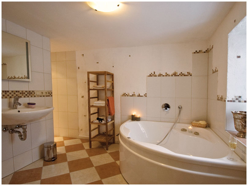 Einen kleinen Wellnessbereich bietet das individuell gestaltete Bad mit begehbarer Dusche, abgetrennter Toilette und der großen Eckbadewanne.