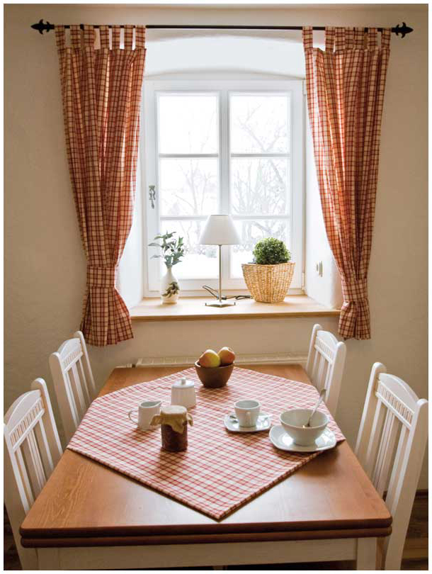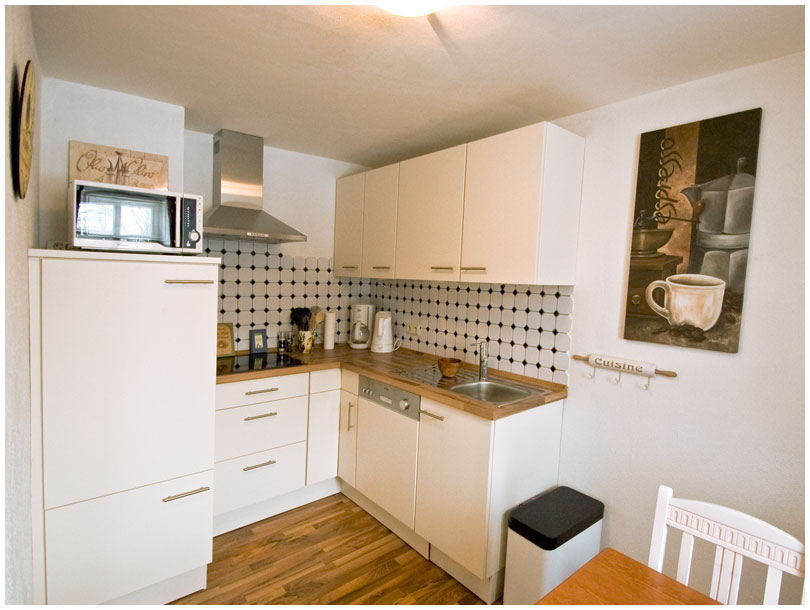 Die neu eingebaute, komfortabel eingerichtete Küche im Erdgeschoss verfügt über einen Herd mit Cerankochfeld, Geschirrspüler, Mikrowelle. In der gemütlichen Küche befindet sich auch ein Esstisch.