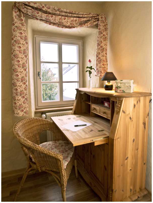 kleiner heller Sitzplatz mit Sekretär vorhanden.
